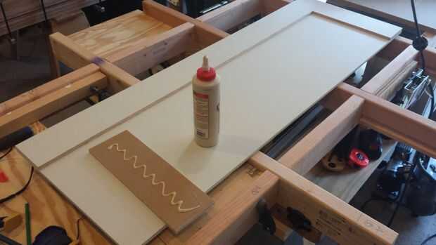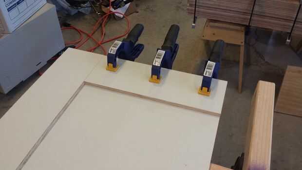 Suavizar todos los bordes para asegurar que la madera contrachapada no salir durante el proceso de montaje, también ayuda el proceso de pintura cuando los bordes no son muy afilados. Encolar y clavar la tira a la puerta de la parte trasera con un montón de cola para madera y 5/8" brad clavo, asegurándose que el borde y esquinas queden al ras, entonces utilizan unas pinzas para aplicar la presión necesaria para el pegamento fijar. Hacer esto para todas las puertas.