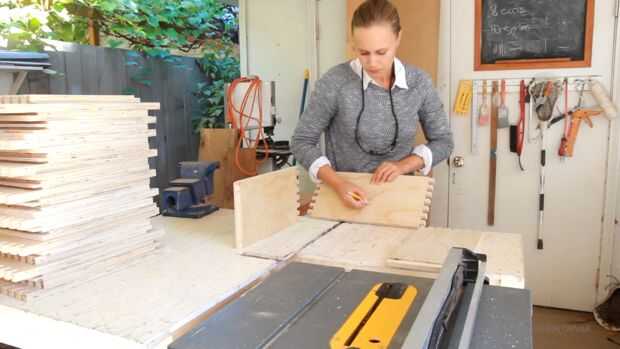 Así que ahora todas las piezas se cortan, y ahora es una cuestión de cómo conectar la parte inferior. Decidí cortar un surco en todas las piezas que puede resbalarse por la madera prensada. Primero hice una marca en cada una de las piezas, que es hacia abajo y donde debe hacerse una ranura. Puede conseguir un poco confuso con que lado es que creo que siempre es una buena idea para hacer un montón de marcas para estar seguro.