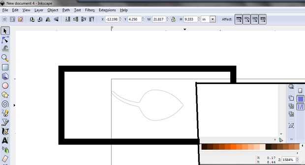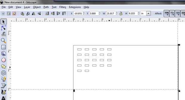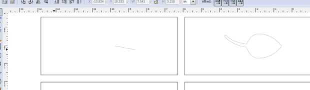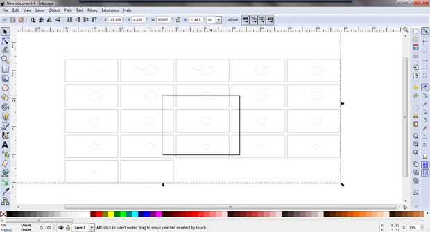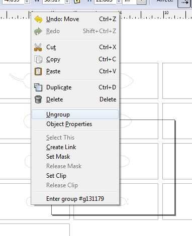 Además, los contornos no se escalan. Presionando Ctrl-A para seleccionar todo, arrastre el primer buen contorno en la esquina superior izquierda del documento que se puede medir con la regla. Para el ratón quiero escalarla para que la longitud total es de 2,5 pulgadas de largo. Para obtener una mejor medición Coloque la cola en el borde izquierdo de la página y pase el cursor sobre la nariz del ratón. En la esquina inferior derecha la ventana de Inkscape muestra la posición del cursor, dando una medida más exacta que la regla.