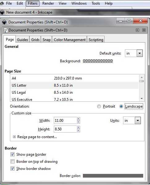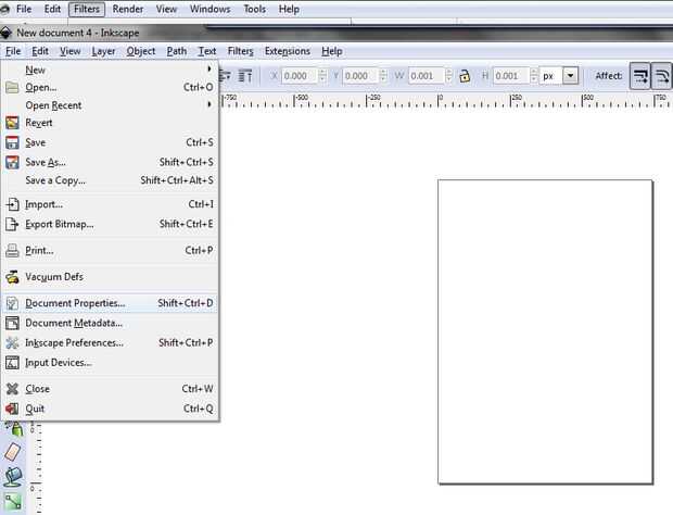 Opcionalmente puede abrir el archivo SVG generado directamente o iniciar Inkscape e importar el archivo SVG en el nuevo documento. En cualquier caso, necesita configurar el documento para su tamaño de papel. En el menú archivo , seleccione Propiedades de documento.