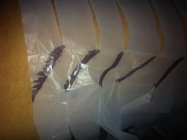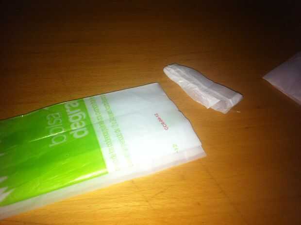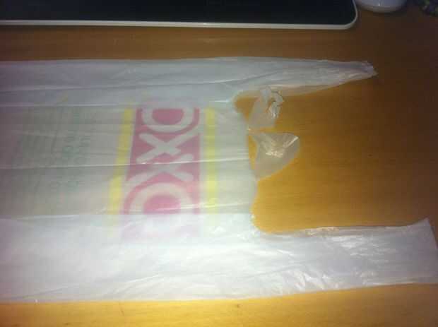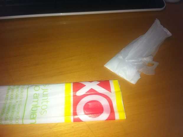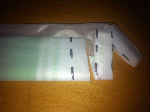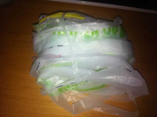 Tome una bolsa de plástico, doble plana para doblar la pieza de la manija plana también.