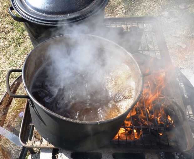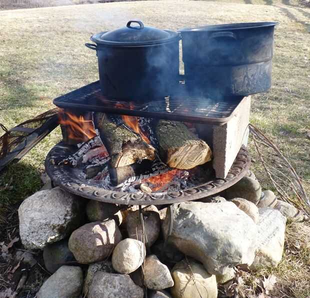 En mi fogón de hierro fundido colocar unos separadores de bloques de hormigón y superior con una rejilla de nevera vieja. I hervir y hervir y hervir, rellenar continuamente el centro de ebullición olla de olla de calentamiento, hasta que la savia haya desaparecido. A hervir abajo de 40 galones de savia podría tener 2 días completos.