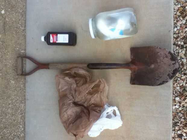 todo lo que necesita es una pala, bolsas de plástico, un tarro grande (galón frascos de salmuera son grandes) y peróxido de hidrógeno, si lo prefieres látex guantes también son una buena idea