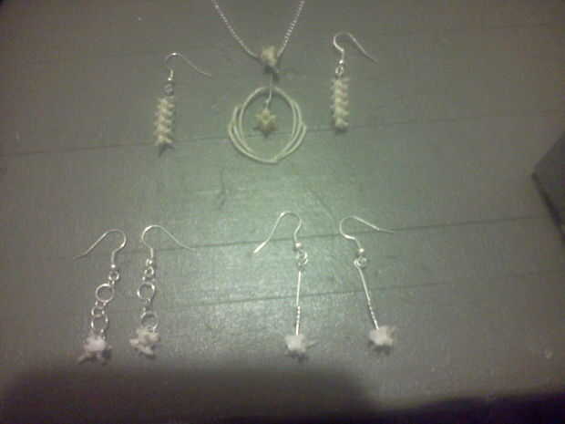 la fabricación de la joyería es muy fácil todo lo que necesitas son algunos resultados genéricos y otras piezas de la joyería que todos los éstos se pueden comprar en Michaels o hay otras tiendas de artesanía es un cuadro con un conjunto de ejemplos pero varían según qué tipo de joyería que desee. para sostener los huesos juntos usar pegamento viejo regular el tipo de gel es la mejor pero no es necesario. y el secreto más grande es aerosol de acrílico claro que también se encuentran en tiendas de artesanía