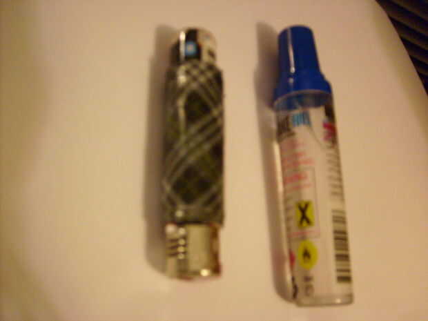 Encontré un gas butano recargable más ligero disponible para $1 y un contenedor de combustible por $1. Así que por $2... Llevar un suministro de gas butano y un mechero de años... (ver foto). Tenga en cuenta, envuelve el encendedor con cinta... el más ligero fue muy rosa... y soy un chico tan macho (jajaja) que la cinta cubre la rosa, mientras me daba aproximadamente 1 pie de cinta para llevar.