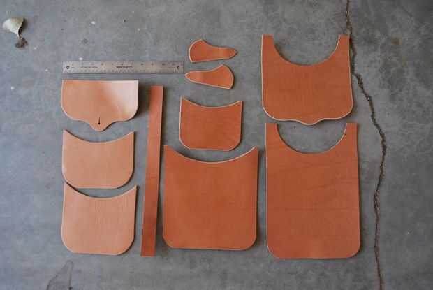 Incluso no recuerdo donde encontré la inspiración para este bolso pero recuerdo esbozar bastante exactamente. Me gustan los bolsillos interiores y exteriores, una aleta que quiere mantenerse siempre cerrada y un bolsillo seguro para objetos de valor. Después de esbozar todo el plan en papel cuadriculado corté las piezas de cuero pesado roble curtido. Las dimensiones exactas no importan en el gran esquema de las cosas; debe ser diseñado para adaptarse a su tamaño y necesidades. La foto de arriba incluye todas las piezas excepto la franja que conecta la parte delantera a la espalda y las piezas que hacen que la correa de hombro.