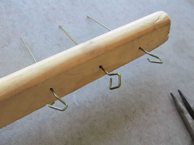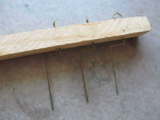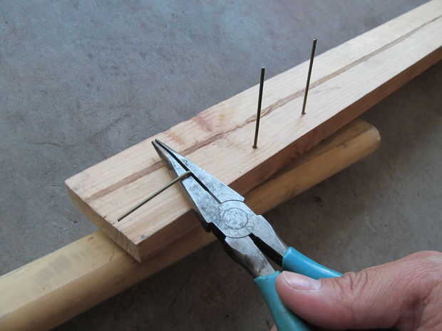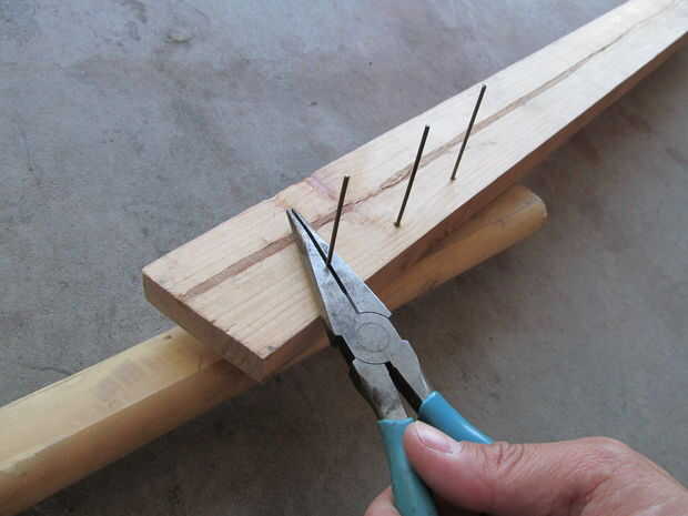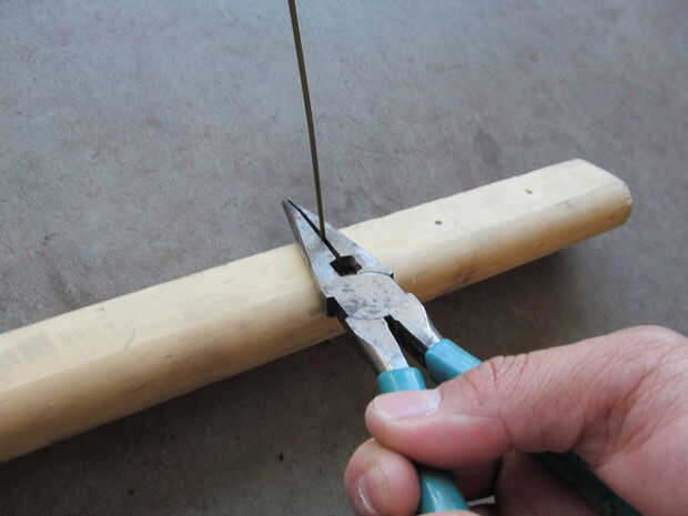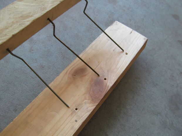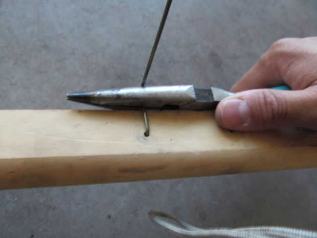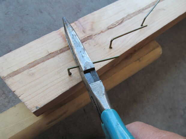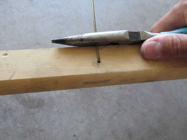 Place a hook through each hole. Utilice las pinzas para hacer dos curvas de 90 grados en cada cable. Se verá como la imagen 7. Coloque los cables a través de la segunda pieza de madera y hacer un final de 90 grados de la curva para mantener el mango en su lugar. Recorte el exceso de cable para que no interfieran entre sí durante la operación.