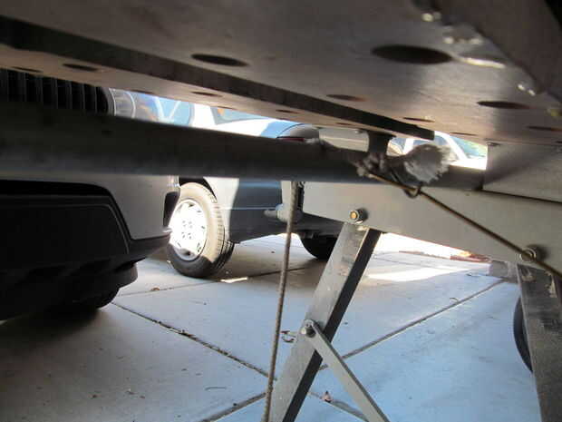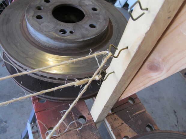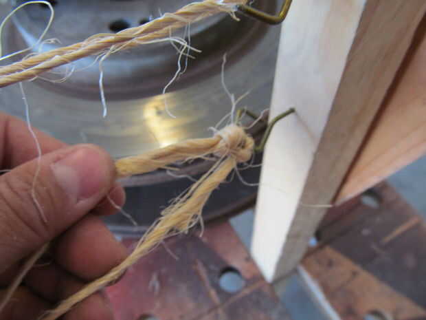 Empezar por atar la cuerda al gancho de la parte superior o inferior. Ejecute el hilo hacia adelante y hacia atrás entre cada gancho y el punto de anclaje. En la tercera ejecutar debe ser en el gancho usted comenzó con. Atar apagado otra vez. Cada gancho debe tener 2 líneas para un total de 6. Si quieres que puedes hacer otra carrera para un total de 12 líneas. Es importante que cada línea tiene la misma cantidad de tensión. El peso que cuelga ayuda a que eso suceda. Estoy usando los rotores de la rotura a pesar abajo bancos.