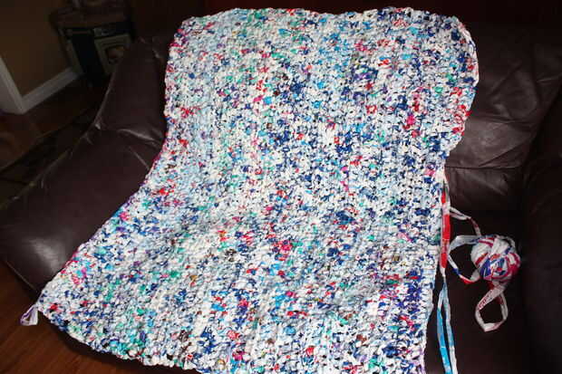 Canadá misión cristiana de Haití del noroeste tiene un programa de Haití de 4 esteras que distribuye leche saco esteras y bolsas para la gente de Haití. Primero escuché sobre él cuando estaba hablando con unas mujeres en un grupo local de café. Tenían un exceso del hilo de bolsa de leche hecha y lista para ser usada, pero no hay suficiente gente para hacer las esteras. Desde que supe cómo a ganchillo me ofrecí como voluntaria tratar de hacer un tapete si se le caen de una carga de la lana en mi casa.