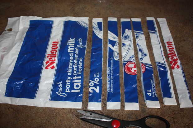 Coloque la bolsa de leche fuera plana y corte el borde de la parte inferior de la bolsa, convirtiéndolo en un tubo de. No corte los bordes laterales. Cuando cortamos la bolsa de leche forman lazos. Estos lazos se ensartados para crear nuestro hilo.