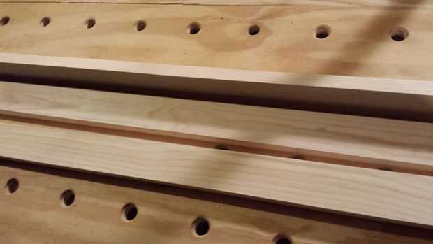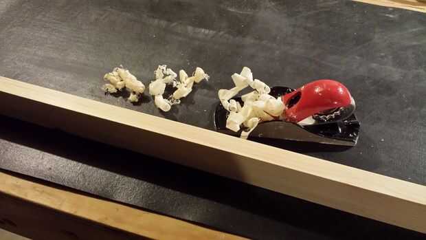 Después les rasga en tiras de 2" de ancho y una mano de cepillado con el plano de la caja pequeña a lo largo de los bordes para eliminar las marcas de sierra, casi no era necesario el lijado final. El plano afilado cortando madera de pino y que ancho total de afeitar fue una experiencia agradable...