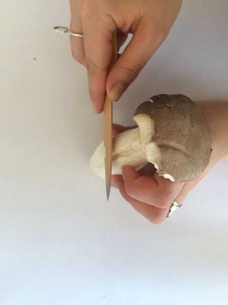 Tome la seta y bisturí para cortar rebanadas pequeñas de la base. Sólo utilice la base como esta es la parte de reproducción que crecerá dentro de la cartulina.