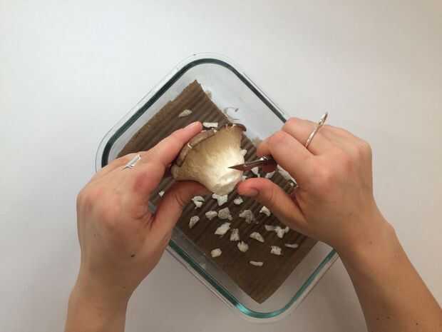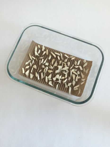 Los pequeños trozos de seta se extendió uniformemente y bastante juntas y cubrir con una hoja de cartón.