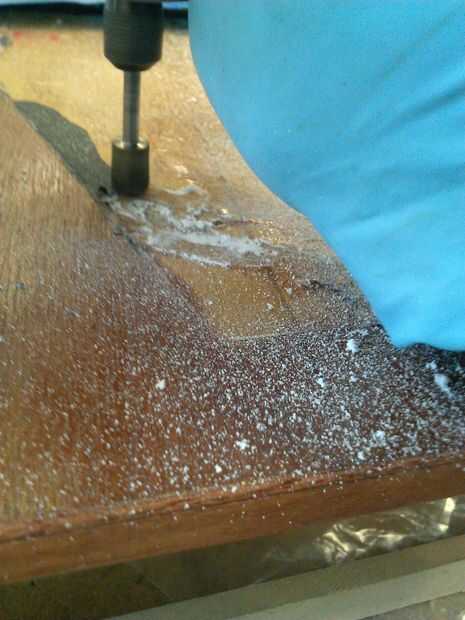 2). la cartulina de papel se pega abajo bastante bien. Tuve que romper el viejo Dremel y la ruta hacia fuera secciones claves, esto me permitió obtener un buen agarre en la cartulina y rasgar secciones grandes de papel.