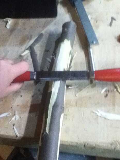 quieres la manija para tomar algún abuso por lo que desea tomar la corteza apagado i utiliza un drawknife pero más instrumentos afilados funcionará, quiere dejar un trozo bastante grande en la parte superior para el montaje de la hoja