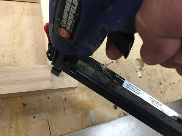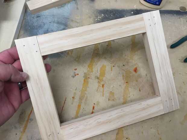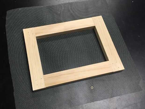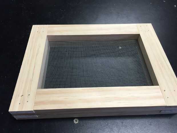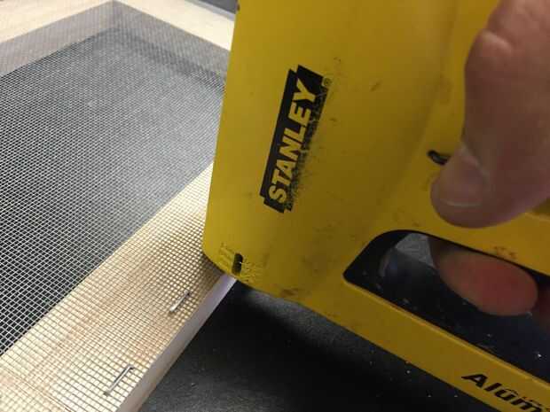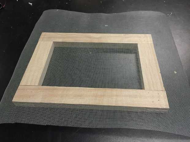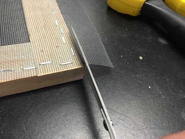 El objetivo es crear dos partes del papel formando la bandeja. Para montar la bandeja se utilizó una combinación de pegamento prueba agua, 0,625" brad calibre 18 clavos y grapas T50. Pegado y clavado de las esquinas de cada bandeja y esperado para que cada Asamblea se seque. Después de todo estaba seco le adjunto pantalla de fibra de vidrio de la ventana a una de las bandejas y había cortado el exceso.