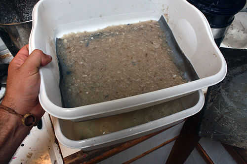 Una vez que las fibras están en el agua, sumergir las manos y agitar el líquido. El objetivo es conseguir algo homogénea sin necesidad de mover la pantalla mucho.