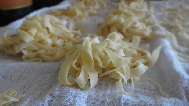 Hacer un pozo en la harina, añadir los huevos batidos. Lentamente bata la harina. Cuando la masa pegajosa, amasar con los dedos. Formar una bola con la masa. Se busca una masa suave y uniforme la consistencia de su lóbulo de la oreja.