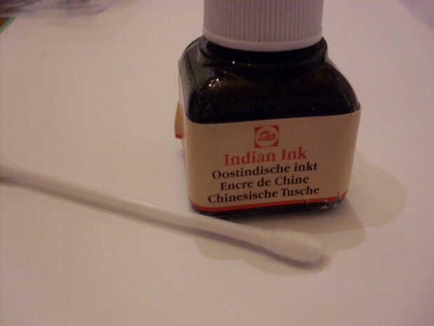 Mojar un algodón pero la tinta china y toda la impresión de una fina capa de tinta. Dejar secar unos 15 minutos. La tinta no debe ser brillante ya cuando se seca. Ahora usted puede limpiarla del exceso de tinta con una toalla de papel húmeda. La tinta si se pega a las piezas negras y limpiarla lejos por todas partes otro. Limpiarla en la misma dirección de los caminos.