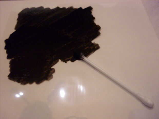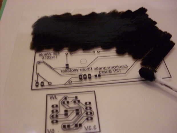 Cuando se mantiene la diapositiva contra una fuente luminosa, te darás cuenta que no es lo suficientemente oscuro. Debe ser muy oscuro para bloquear la luz UV. Hay todo tipo de métodos para oscurecer su impresión. De alojarán sprays, laca para el cabello, pero ninguno de ellos me dieron un resultado más satisfactorio que la tinta china. Es muy fácil de usar y te da la impresión perfecta de negro.