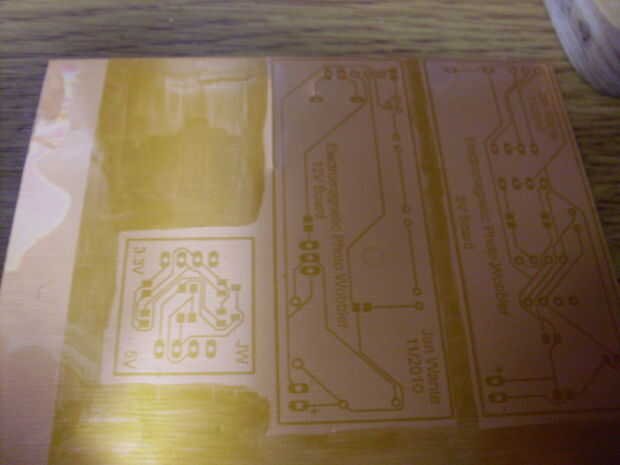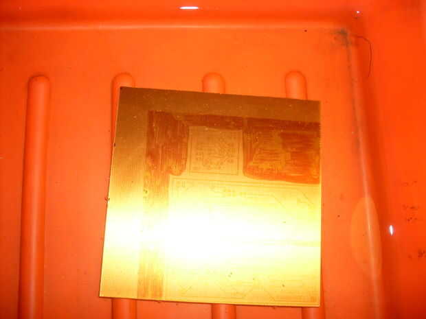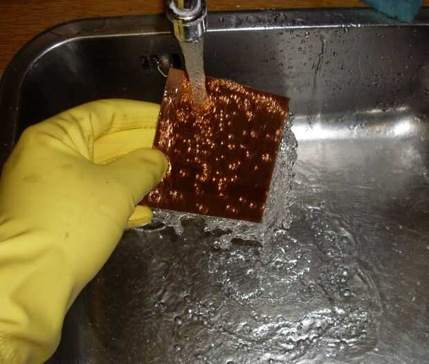 Sacuda la Junta todo un poco y después de un minuto en la solución debe aparecer un débil 'foto' de su diseño. Rápidamente lavar la placa con agua limpia fría para detener el proceso de desarrollo.