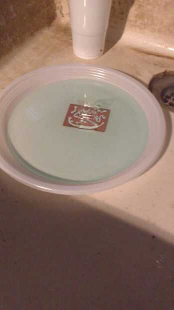 Utilizar cinta adhesiva transparente para crear un "mango" para mover el circuito en la solución de la aguafuerte. Utilizar platos desechables para esto.