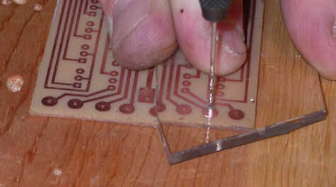Aquí está mi secreto a un montón de pequeños agujeros de perforación con un taladro de mano: usar un trozo de acrílico como una guía de taladro. Taladre un agujero en el acrílico, luego taladre a través de ese agujero y a través de la Junta. El acrílico claro hace fácil alinear la broca correctamente en el centro de cada almohadilla. Después de una docena de agujeros más o menos, el "agujero" en el acrílico comenzará a "aflojen"--sólo perforar otro agujero y seguir adelante.
