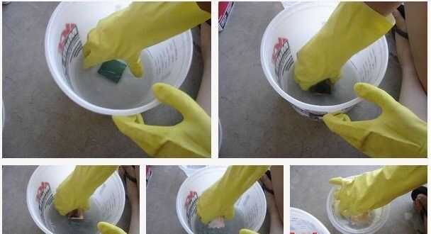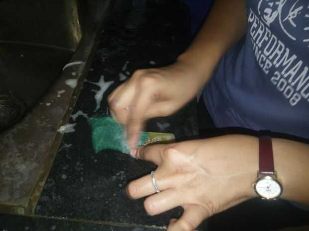 y lavar como cualquier dish(utensil) generalmente con un exfoliante pero intenta limpiar solamente en una dirección