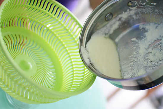 Coloque el colador sobre la jarra (preferentemente de reposo en él) y vierta la mezcla por el colador.