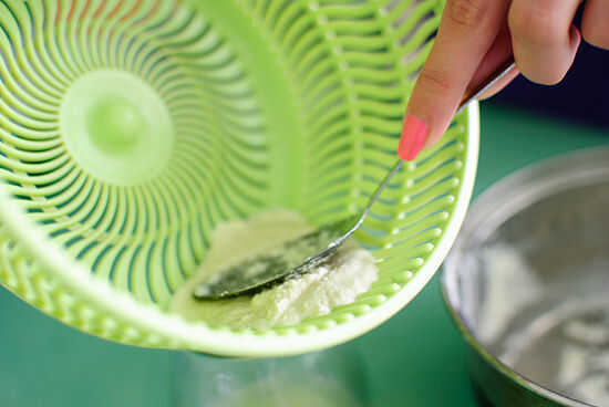 Usar la cuchara para presionar a los grupos a través de la coladera y suelte el líquido.
