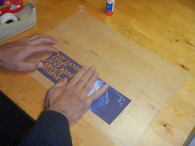 Presione la etiqueta engomada de papel, pegamento hacia abajo, en el papel de cera, manteniendo un margen inferior de aproximadamente 1" expuesta del papel de cera.