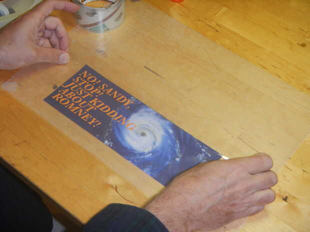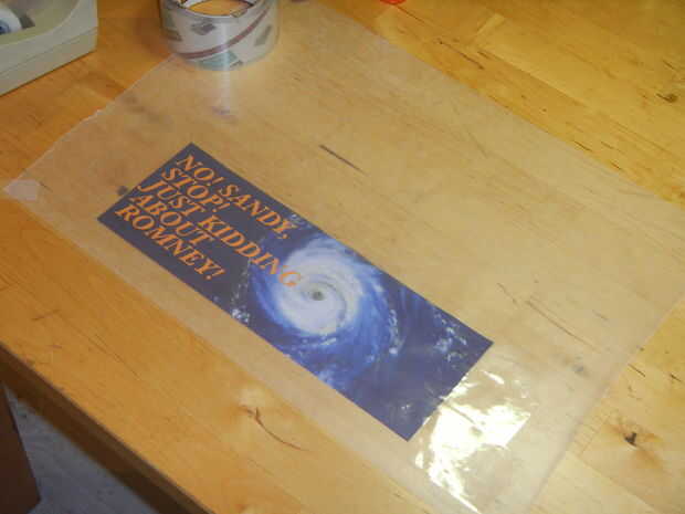 Corte una longitud de cinta de embalaje transparente de aproximadamente 2 pulgadas más de largo que la etiqueta es amplia. Sostenga la cinta en cada extremo, y manteniéndolo tenso, llevar la cinta en contacto con el papel encerado a lo largo de una línea de 1/2" por debajo del borde inferior de la etiqueta. Presionar poco a poco en la etiqueta y en el papel de cera.