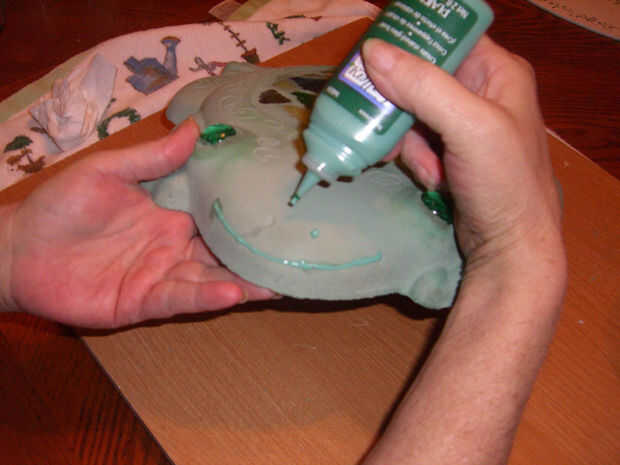 que quería añadir un poco más de un toque decorativo a mi piedra usé un medio de vidrieras para delinear la boca y la nariz por lo que estarían mejor.