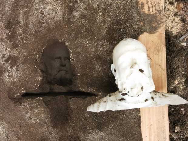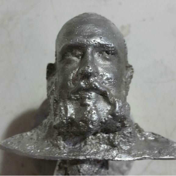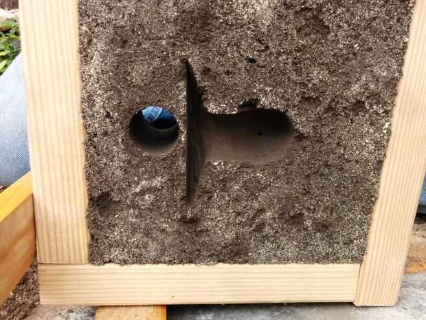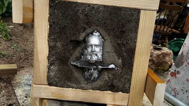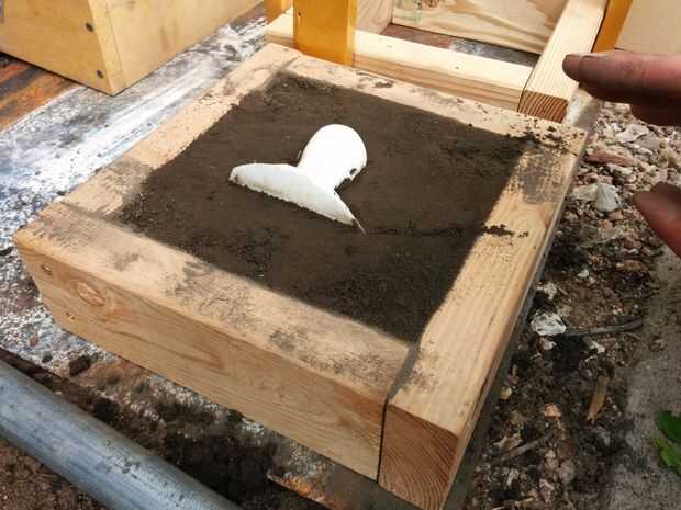 La parte superior de la mitad de la caja de moldeo fue instalado en el lugar y llena de arena verde en 1" capas, dejando 1" redondo pasador en su lugar, para proporcionar un bebedero para llenar el molde de. Una vez que la mitad superior del molde se llena y llena a la tapa que estábamos listos para el momento de la verdad, partir el molde y retirar el original. La barba había socavado un poco haciendo este paso difícil, pero tenemos suerte.