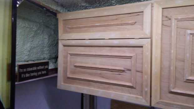 Cuando empecé en estilo divide la zona en siete espacios para los gabinetes. La primera puerta del mueble es una compuesto puerta con bisagras en el centro que se abre desde la parte inferior. Quería la puerta haga pivotar hacia arriba porque está sobre la puerta de entrada. Esto muestra la diferencia en carga y descarga de los armarios. Tengo que levantar la puerta con una mano mientras busco algo dentro. Todos los demás doblan hacia abajo y permanecerán hasta que cierre.
