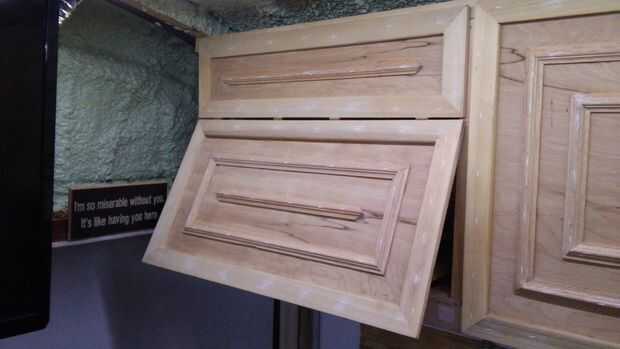 A continuación quería un gabinete más lujo en el área de la sala de estar, que está enfrente de la cocina. Mi primer pensamiento fue emparejar los gabinetes de cocina que obtuve de la restauración. Un amigo sugirió que hacen diferentes para definir las diferentes áreas a pesar de comparten el mismo espacio pero en lados opuestos del autobús. Dio a luz a estilo 2.