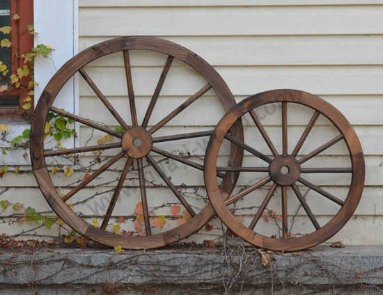 Una rueda de carreta decorativa tradicional consiste en normalmente concentrador, radios, felloe y acero del neumático. Pueden ser natural, antigüedad acabado quemado, la mancha o la pintura en diversos colores.