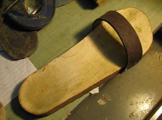 Para una correa, utilicé un trozo de una vieja correa de cuero. En lugar de utilizar una hebilla para ajustar la longitud de la correa como una sandalia comprada, sólo corté la correa para caber el pie. La correa es sostenida en lugar por los tornillos de cada lado, como en el original. Las correas están inclinadas ligeramente hacia delante para acomodar el arco del pie... En una, la correa fue inicialmente inclinada demasiado y llevaba un agujero en la parte superior de mi dedo del pie, así que tuve que cambiarlo un poco.