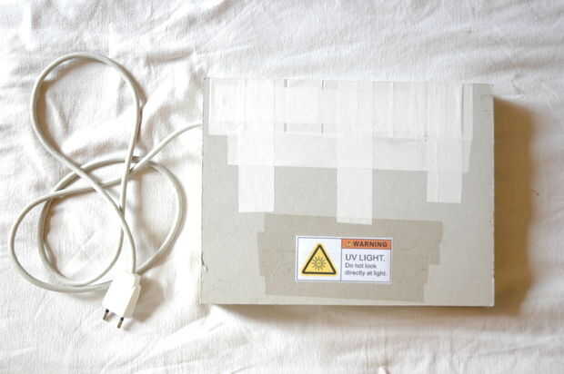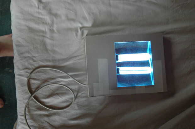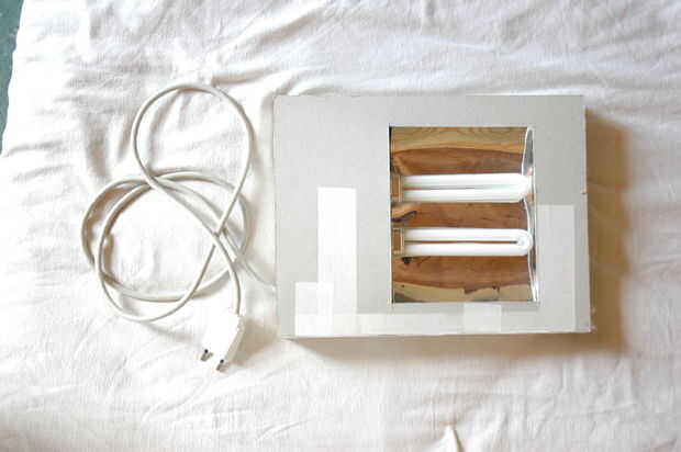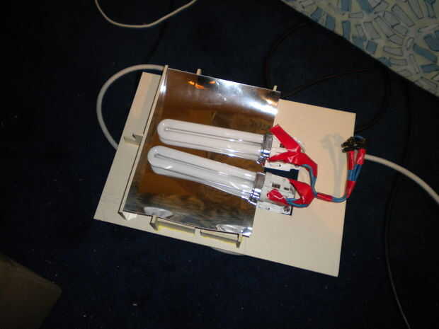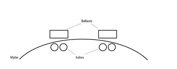 Por desgracia, no tengo foto de todo el proceso de construcción, pero básicamente, quiere una base curvada para pegar el mylar. Tiene que ser lo suficientemente grande como para dejar el lastre ir debajo de él, pero los bombillas y tubos en la parte superior.