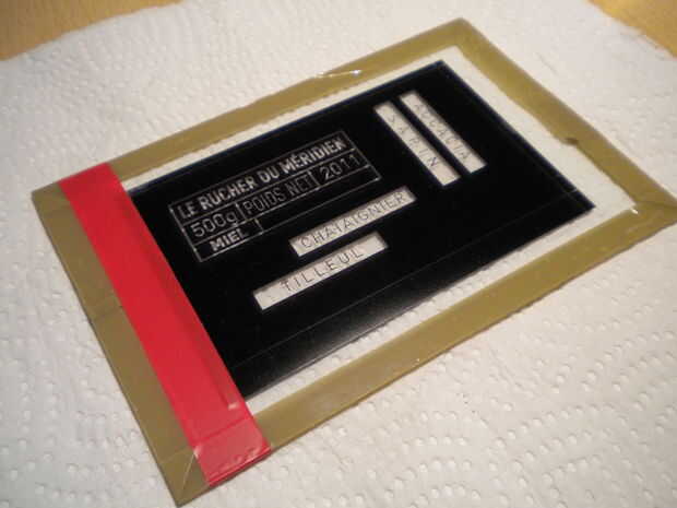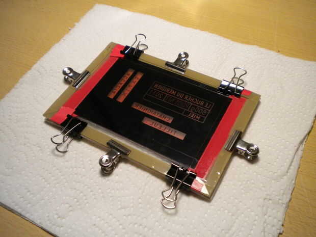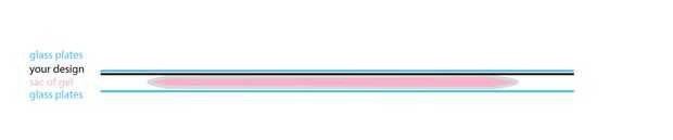 impreso en rhodoïd transparente, necesita tomar un saco de gel, puso su diseño y toda la cosa entre placas de cristal de la abrazadera. Descubrí que las mordazas más, mejor. Esto es porque el gel es lo suficientemente grueso y no en posición plana (muy plano) Si utiliza sólo 3 o 4 abrazaderas. La presión debe ser igual todo el aparato.