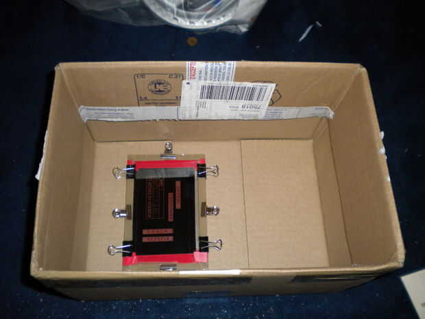 Lo que usted necesita ahora es la caja de cartón y suavemente Coloque su vaso diseño / gel / cristal sandwich en él. A continuación, el complejo de la caja de luz en la parte superior. No encienda las luces todavía, asegúrese de que su diseño es al revés, y que el sandwich está en el área donde habrá más UV luz sorprendente.