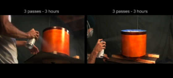 Golpear el tambor entero con un tleast 2 capas del aerosol de la laca de brillo. Lo sé... cuando usted está haciendo los tambores es resistente a ser paciente... pero si tu no en prisa, yo haría 4 capas o más. Esto bloquea la zona ámbar y lo protege. Cualquier exceso de rociado de nuestro siguiente paso puede ser redondeado cuidadosamente con lana de acero 0000 #.