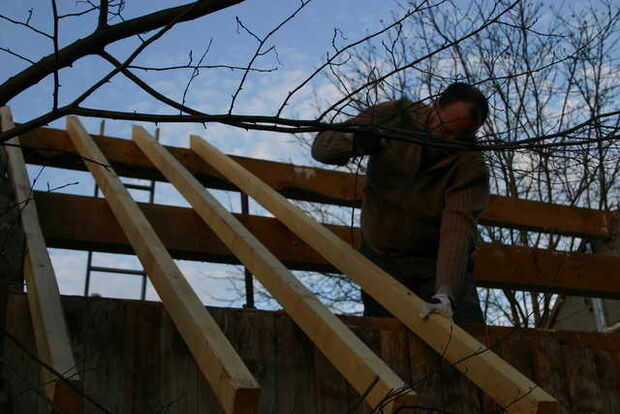 Comenzamos poniendo las vigas verticales, el tamaño que necesita hacer depende del peso que esperas llevar a y la distancia entre los puntos de descanso. En realidad es un simple cálculo. No te olvides de tener en cuenta cargos excepcionales: nieve, viento... El slopier el techo, cuanto menos peso se caries (proyección de peso)