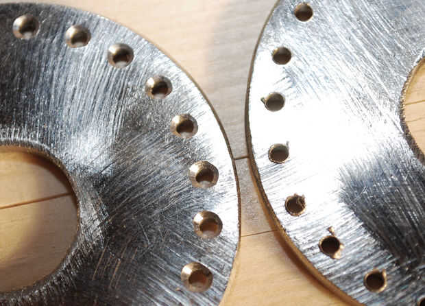 Sin el biselado de los agujeros de los radios, lo más probable es que el rayo no incluso cabrían alrededor de la curva como se muestra en la foto 17. Biselado se realiza en ambos lados de todos los discos de 4. El proceso sólo lleva unos minutos.