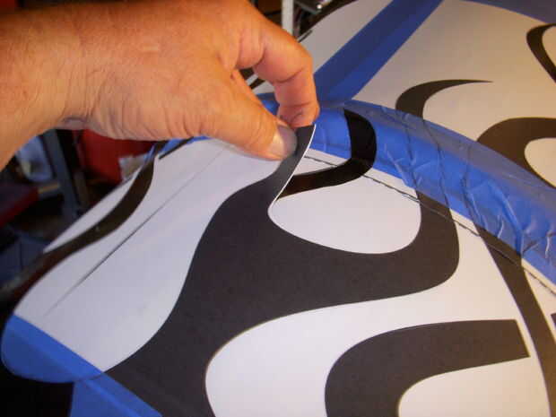 Puede descargar plantillas de llamas de Duplicolor sitio. Usé Photoshop para hacer que las llamas el tamaño que quería, y luego os los adjunto al tambor. Te darás cuenta que tuve que cortar las llamas en el canto rodado en el cañón, utilizando cinta de pintor lleno de la zona y había ampliado las llamas a la línea de arriba. Con cemento de contacto os adjunto la plantilla al tambor, corte las llamas con un cuchillo afilado.