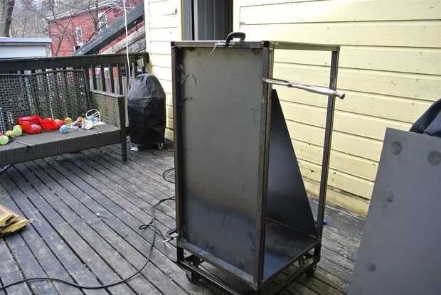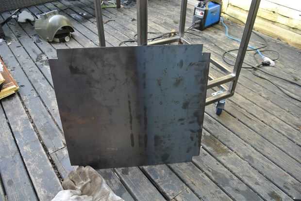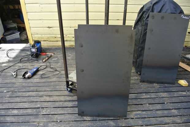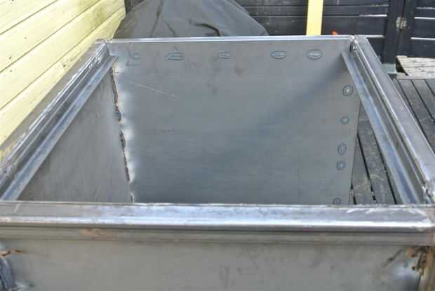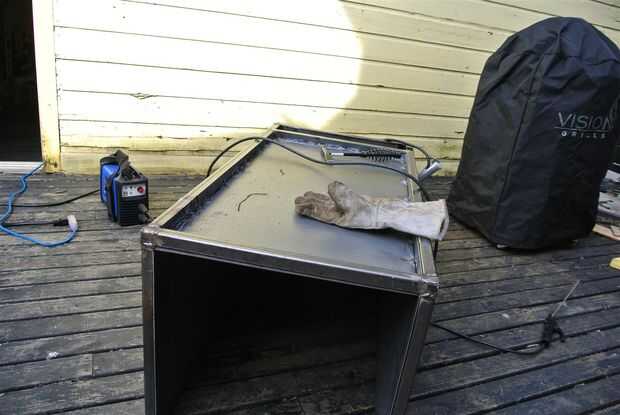 Las paredes exteriores están hechas de chapa de calibre 16. Tenía un orificio para que el tubo para la rosticería podría soldarse entre la pared. Las paredes fueron después soldado con autógena alrededor de todo el camino, esto es opcional y sólo es necesario ya que va ser llenado las paredes con arcilla de gatos.