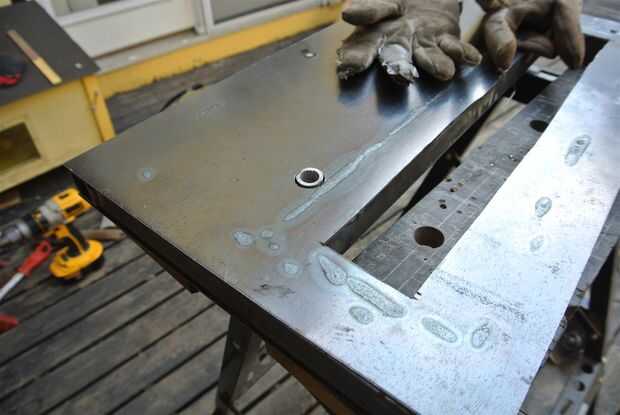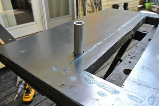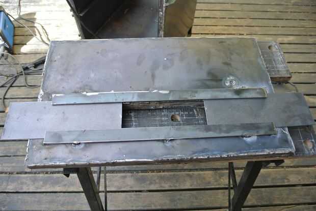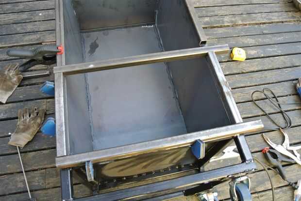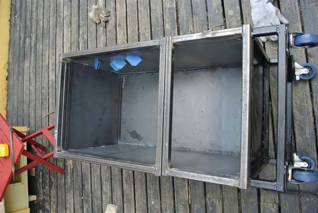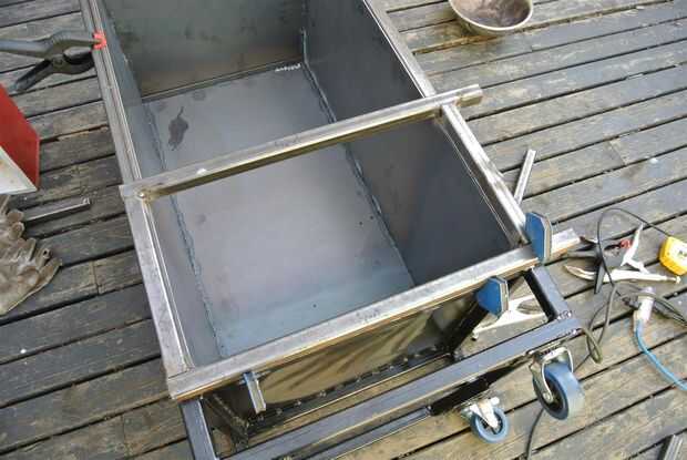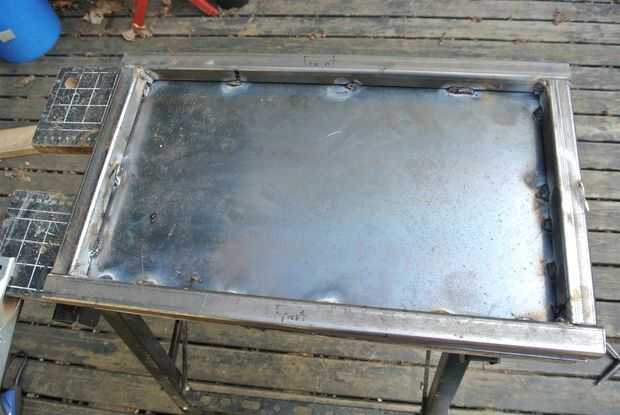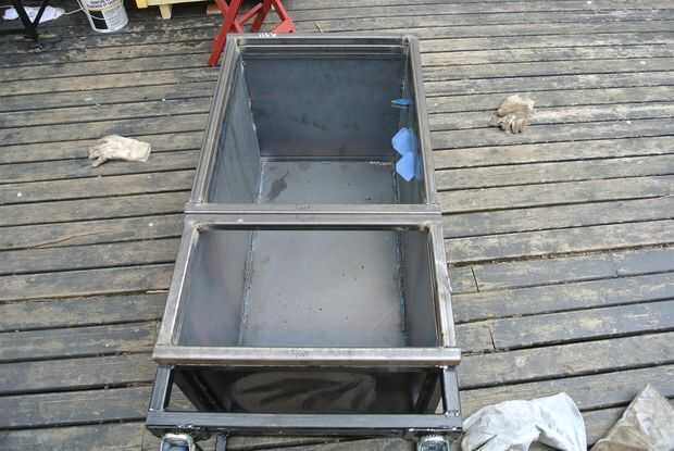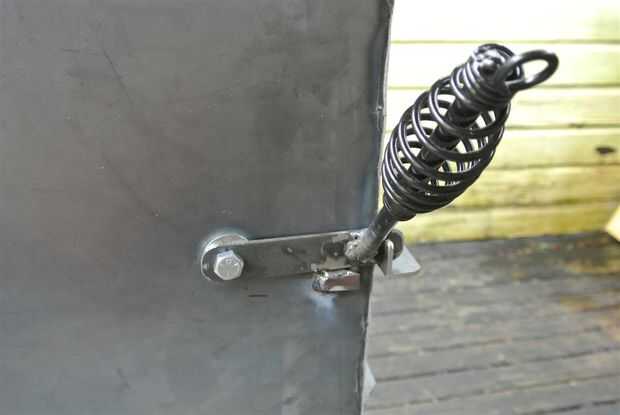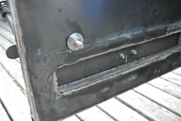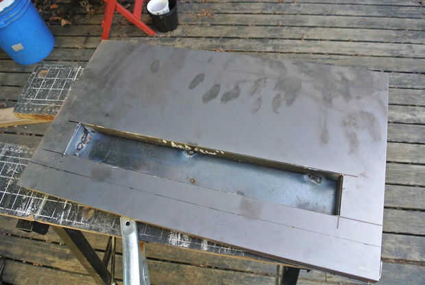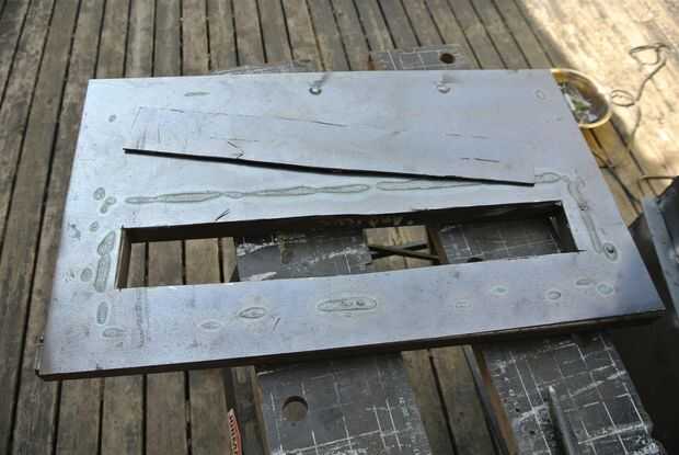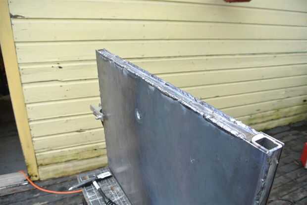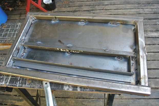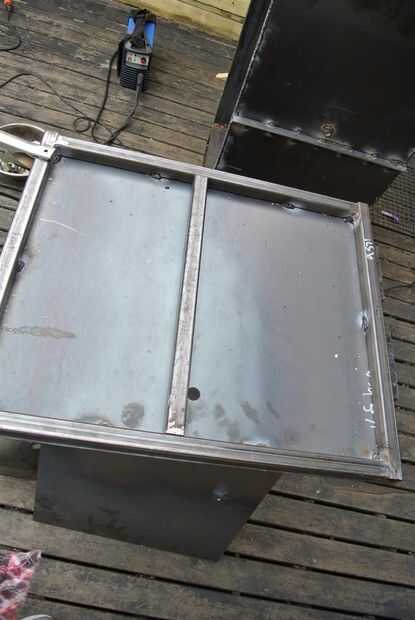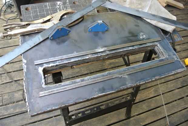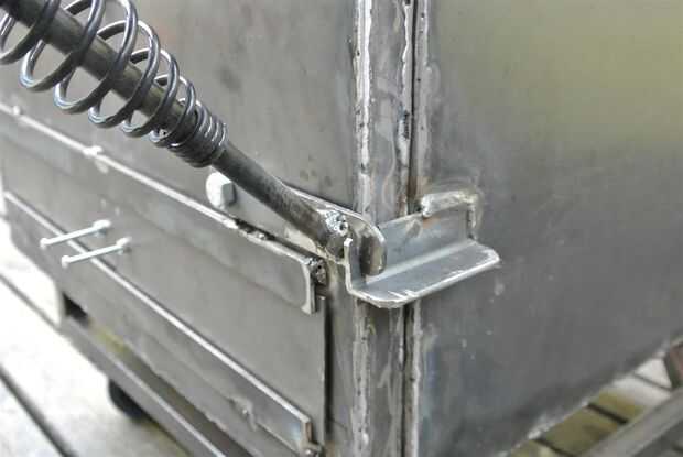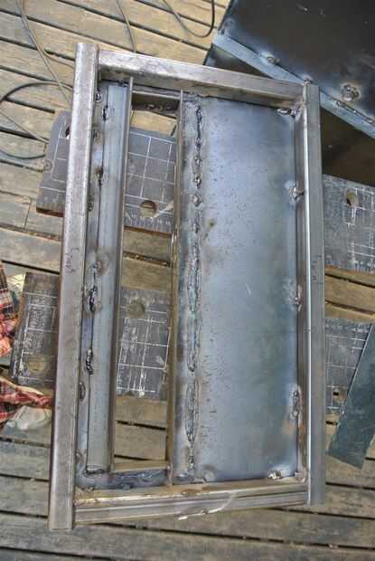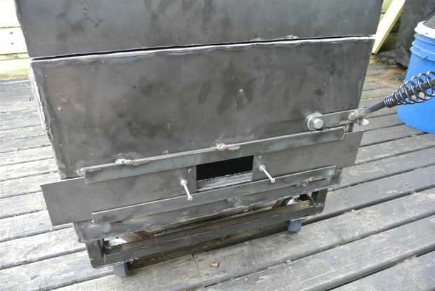Que estén hechos de 1 "x 1"x1/8"tubo, al igual que el marco, luego cubiertos con chapa de acero. El mecanismo es un tubo soldado con autógena en lugar de las puertas y luego un tornillo, algunos acero es el pestillo y un martillo de picapedrero sirve como asa resistente al calor.