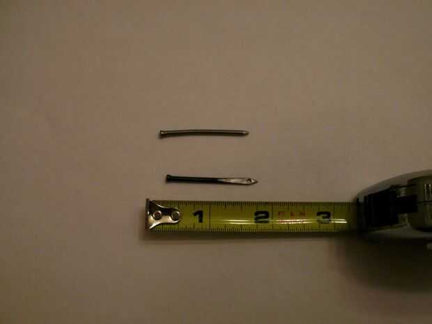 Tomé un clavo de acabado de número 3 y había aplanado final golpeando con un martillo. Clavos de acabado son comúnmente acero, por lo que no necesita calor para aplanarla. Mía puse en un pequeño yunque de lo libra, pero sobre cualquier liso, objeto metal duro podría ser utilizado como un yunque improvisado.