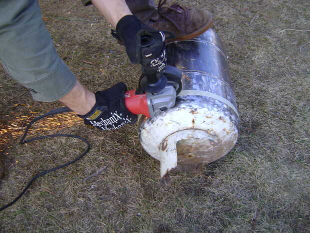 Al seleccionar un viejo tanque de acero, las precauciones deben hacerse para asegurarse que el depósito ya no está bajo presión y que los contenidos se hayan retirado completamente. Una multitud de tanques diferentes puede usarse para este proyecto según el tamaño deseado de la estufa. Esta estufa del cohete se hizo de un viejo tanque de propano de un depósito de metal de chatarra. Antes de cortar en el tanque, tengo completamente vacíos de todo contenido y retire la válvula de la parte superior para exponer el tanque a presión atmosférica. Llene el tanque con agua y vaciarla varias veces para eliminar cualquier sobrante propano humos y gas. Esto asegurará que el propano más denso que el aire es lavado del tanque. A continuación, debe cortar la parte superior del tanque justo por debajo de la curva superior en el tanque, y debe cortarse un agujero en la parte inferior de la parte inferior del tanque por el tubo de alimentación a.