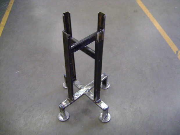 Las piernas de la estufa generalmente deben ser cortos, como para poder buscar en un pote o la cacerola sobre la estufa de pie fácilmente. Cualquier diseño puede ser aceptado por preferencia personal, siempre y cuando sea capaz de soportar por lo menos 100 libras y soportar altas temperaturas. Para esta estufa, pequeñas longitudes de canal C se usaron para hacer una robusta base. Soldar las patas al tanque antes de ir más lejos; Cuando el depósito está lleno es muy pesada. Otra característica que puede ser añadido o alterado en la estufa son las asas.